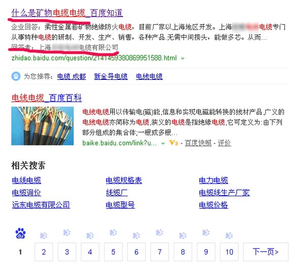 本來正常的關鍵詞百度搜索結果偶爾會出現(xiàn)圖片、新聞、知道、文庫等自家產(chǎn)品,現(xiàn)在某度更是正大光明地在10個自然搜索結果里做起了廣告。以前搜索某些關鍵詞,出現(xiàn)自家產(chǎn)品還都算是自然結果,現(xiàn)在完全變了,百度知道直接根據(jù)關鍵詞賣起了廣告,搜“電纜”的首頁見下圖: